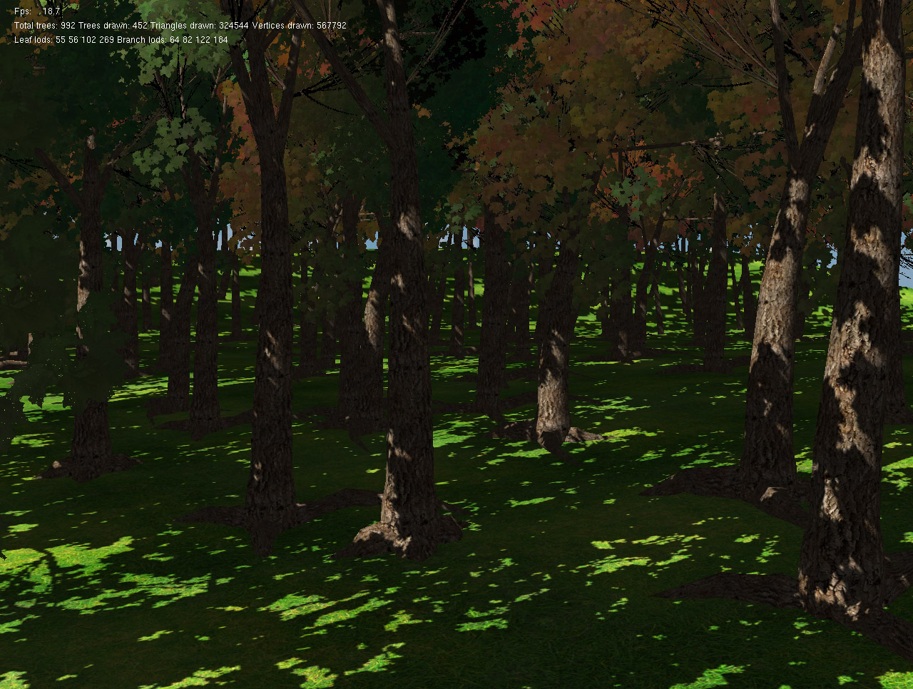 | dc.description.abstract | Real-Time rendering of realistic trees on common graphics hardware represents a big challenge due to their inherent geometric complexity. In most cases, trees are composed of hundreds of thousands of leaves and branches with complex lighting interrelations. We present novel techniques to render and animate photorealistic trees in real-time. The described techniques are easily implemented with commonly available graphics cards, making them suitable to applications such as visual simulations and video games. Polygon counts are significantly reduced by the use of simplified textured geometry for minor branches and billboarded leaf textures. Fast and realistic lighting and shadowing of the leaves and surroundings enhances realism. We animate the tree branches and leaf textures using simple vertex shaders, creating a realistic effect of the tree swaying in the wind. Discrete levels of detail allow rendering of a large number of trees, making it possible to represent realistic forest scenes made of 1000-1500 trees. | en_US |