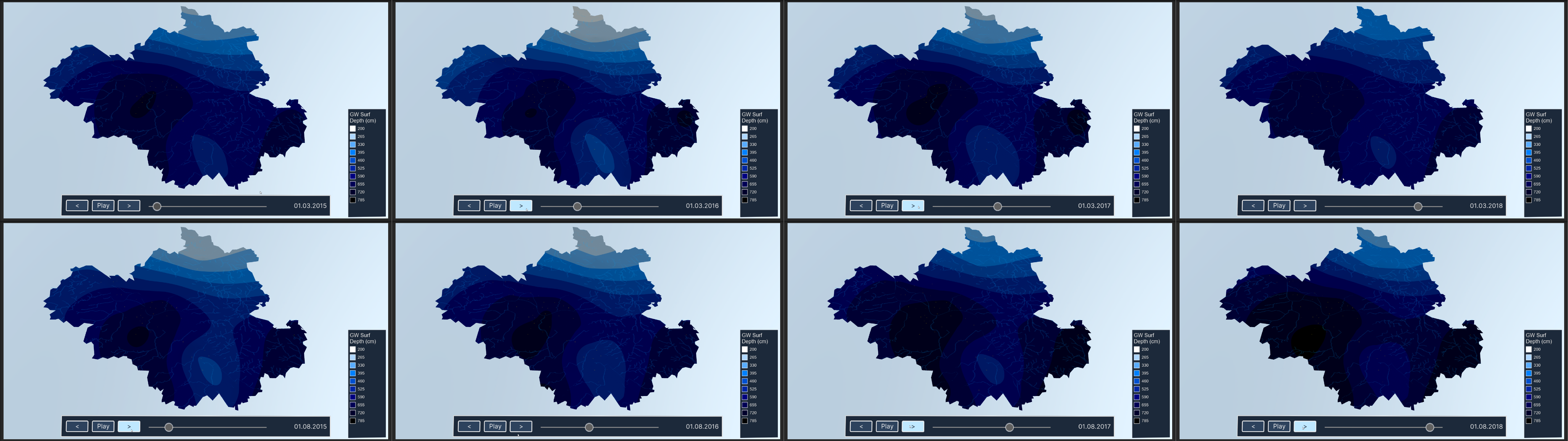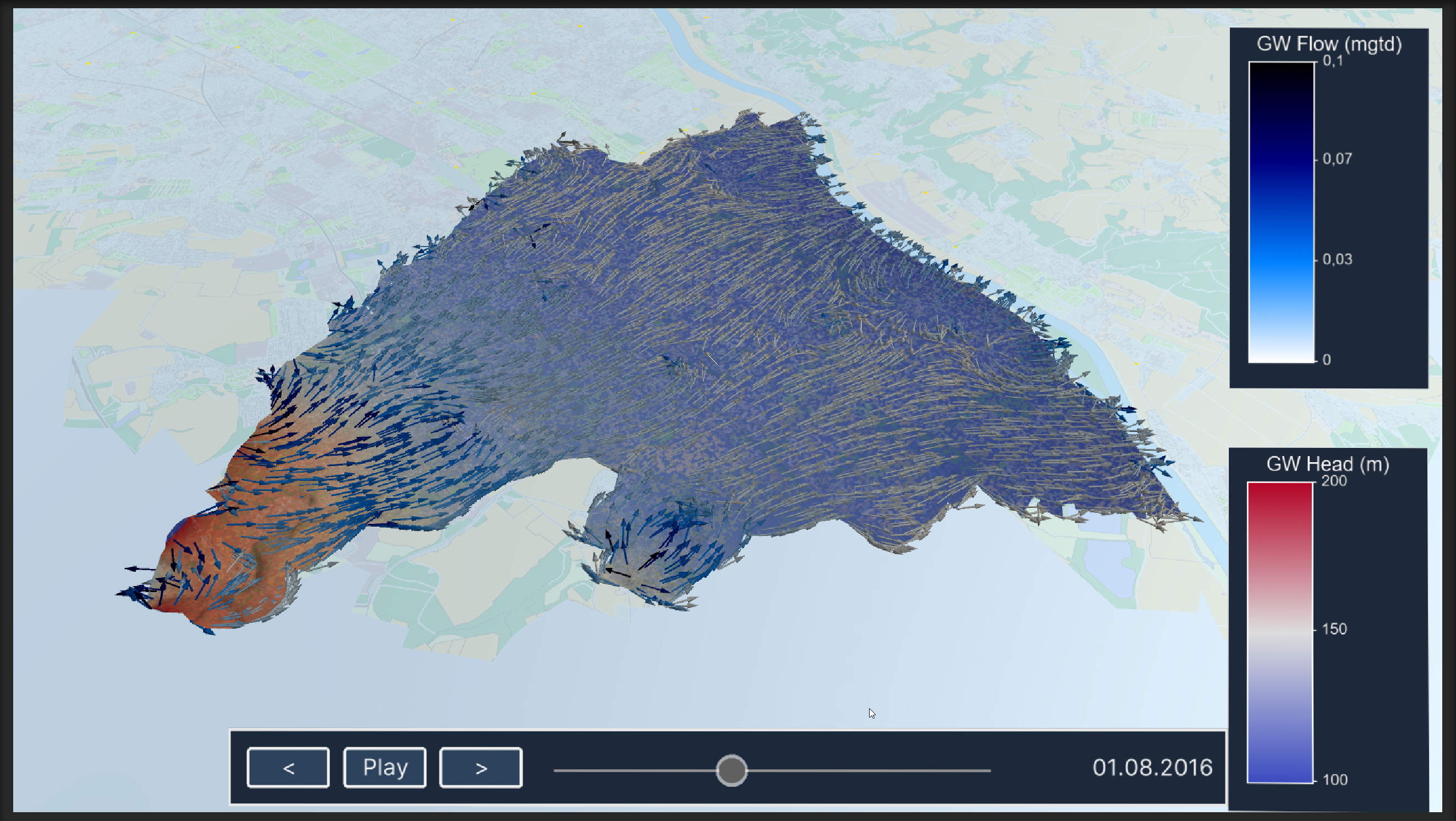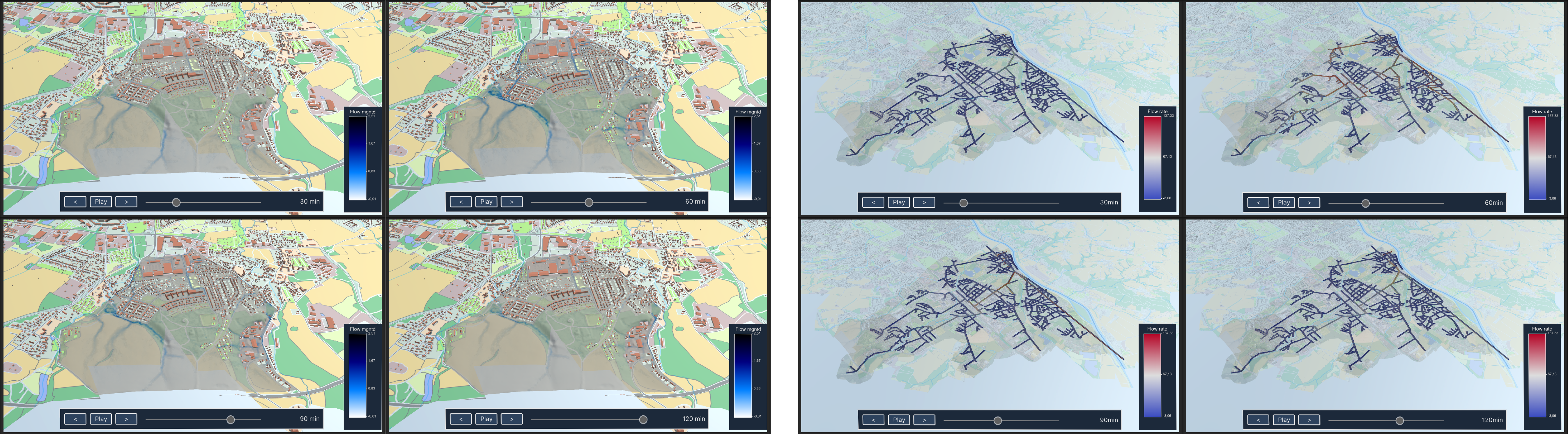 Due to the present climate crisis, the increasing frequency of the water extreme events around urban regions in river basins may result in drastic losses. One of the most effective preventive measures is a prior analysis of the eventual effects to comprehend the future risks of such water extremes. As well as analysis of historical impacts, the model-based management of water extremes have also a crucial role. Therefore, we present a 3-dimensional visual-scenario-based environmental analysis framework by utilising a Virtual Geographic Environment for the visualisation and the exploration of model-based management of hydrological events in urban regions. Within the study, we focused on the City of Dresden in eastern Germany located in the basin of the Elbe River. We integrated a large set of historical observation data and the results of numerical simulations to explore the consequences of modelled heavy precipitation events within different scenarios. Utilising a framework developed in Unity, the resulting visualisation of different scenarios dealing with water extremes simulated with coupled numerical models constitute the overall focus of this particular study. The resulting application is intended as a collaboration platform in terms of the knowledge transfer among domain scientists, stakeholders and the interested public.