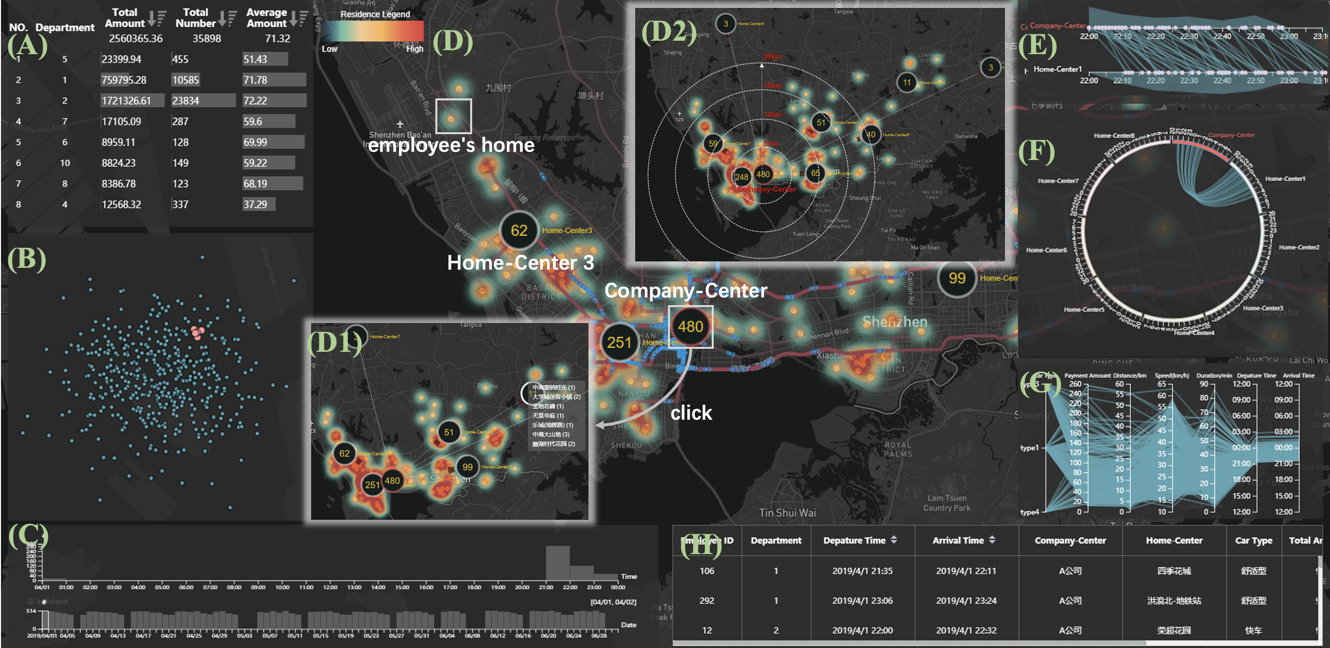 Compensation management is one of the most important elements of personnel management. One type of compensation is traffic supplementary pay for the overtime employees. Conventional analysis of the traffic reimbursement focuses on the basic financial statistics such as the expenditure trends and rankings among different departments in the company. However, it largely ignores the wellbeing of the individuals and their residential distribution that can help improve the effectiveness of compensation strategies. In this work, we propose a visual analytics system based on a company's traffic reimbursement data for the overtime. It assists the compensation managers in understanding the overtime employees' commuting status and providing more indirect compensation benefits for the employees. A user case confirms the efficacy of our system and experts' feedback also suggests that our approach indeed helps them better tackle the problem of analyzing the car-hailing reimbursement data for the overtime.